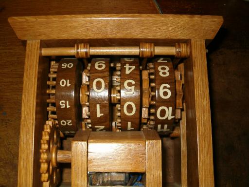 Each number wheel drives the next, via pinions (that can’t be seen in this rear photo). The wheels are held back by “star-wheel” ratchets so they snap from one number to the next in distinct increments. the Wooden Digital