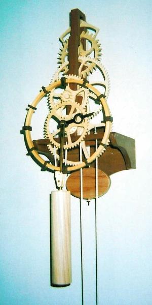 The e-clock is really sweet, made of lacewood and birch, with walnut hands, an ash pendulum and maple weight cans.
