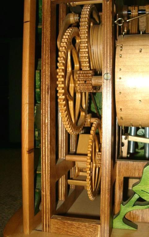 The top opens up to watch it play. The pull-knob at the bottom starts it. As the drum turns, the pins on the drum lift hammers that strike tuned bells made of aluminum bar. The drum turns once in a minute, and stops. There is a “repeat” lever that will hold the stop lever up, and it will play continuously.
