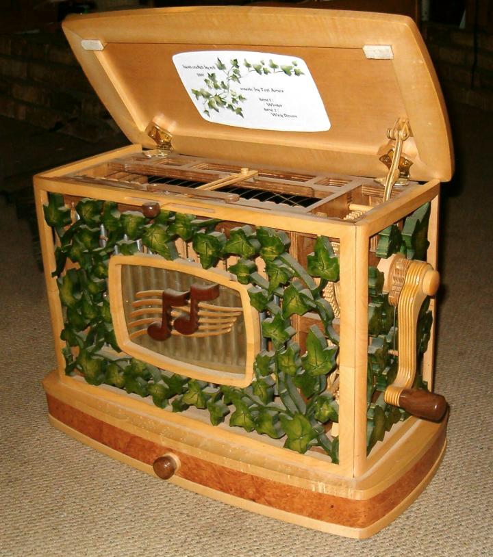 The case is made of solid maple, with beautiful maple burl veneer inset on the top and base. They don’t call it “hard rock” maple for nothing - it took weeks to cut out all that ivy scrollwork.