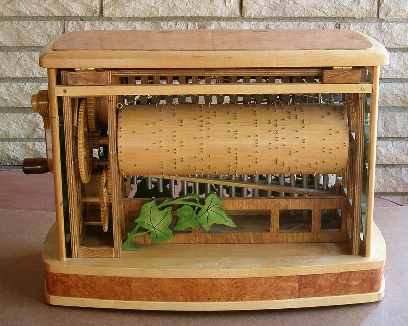 The back is open. It’s actually more interesting to watch it play from the rear - you can better see the “works” working. The drum is made of a 4” carpet roll (very heavy-duty cardboard), covered with maple veneer. There are over 550 small brass pins, each in its ‘exact’ place, corresponding to a given note at a specific time.